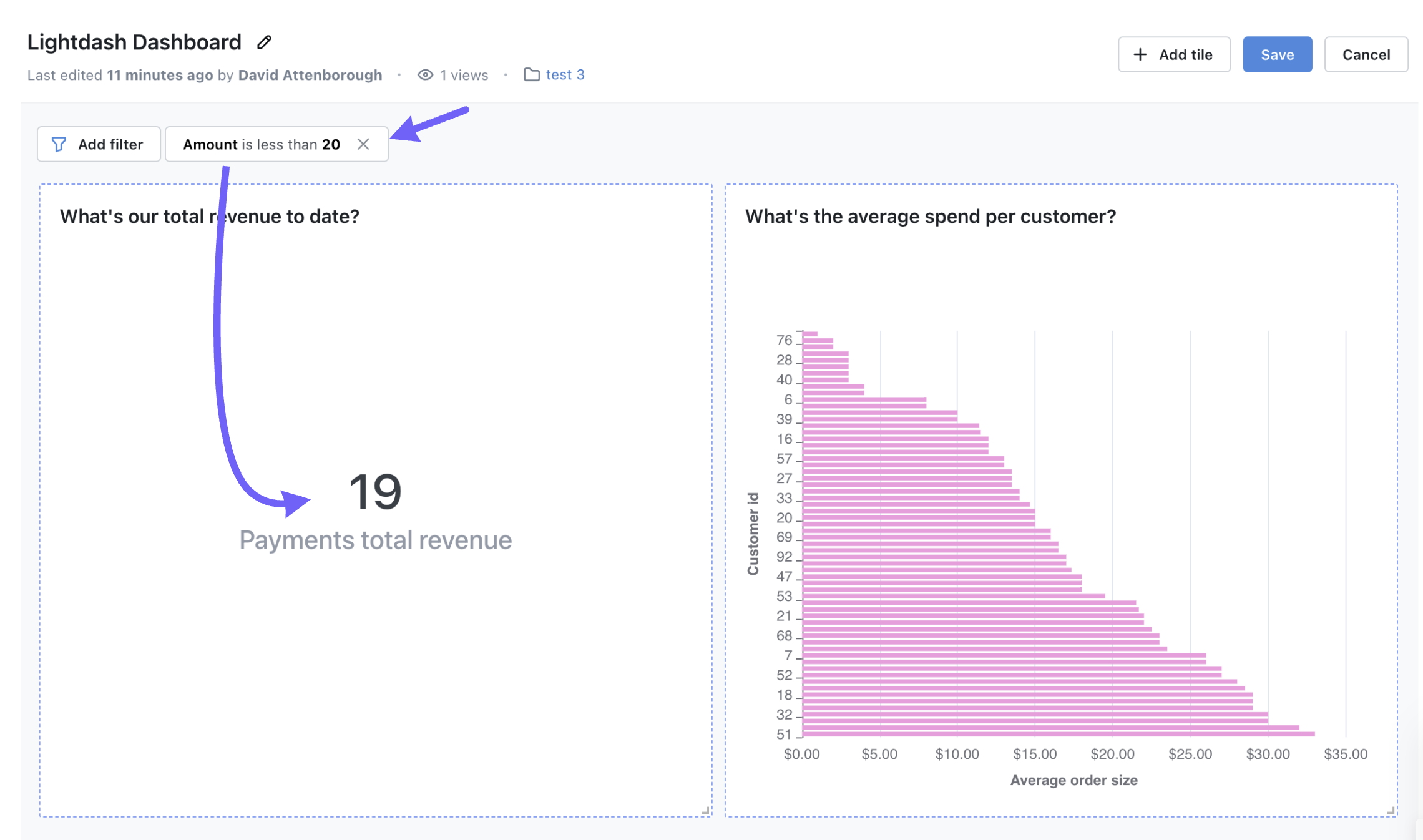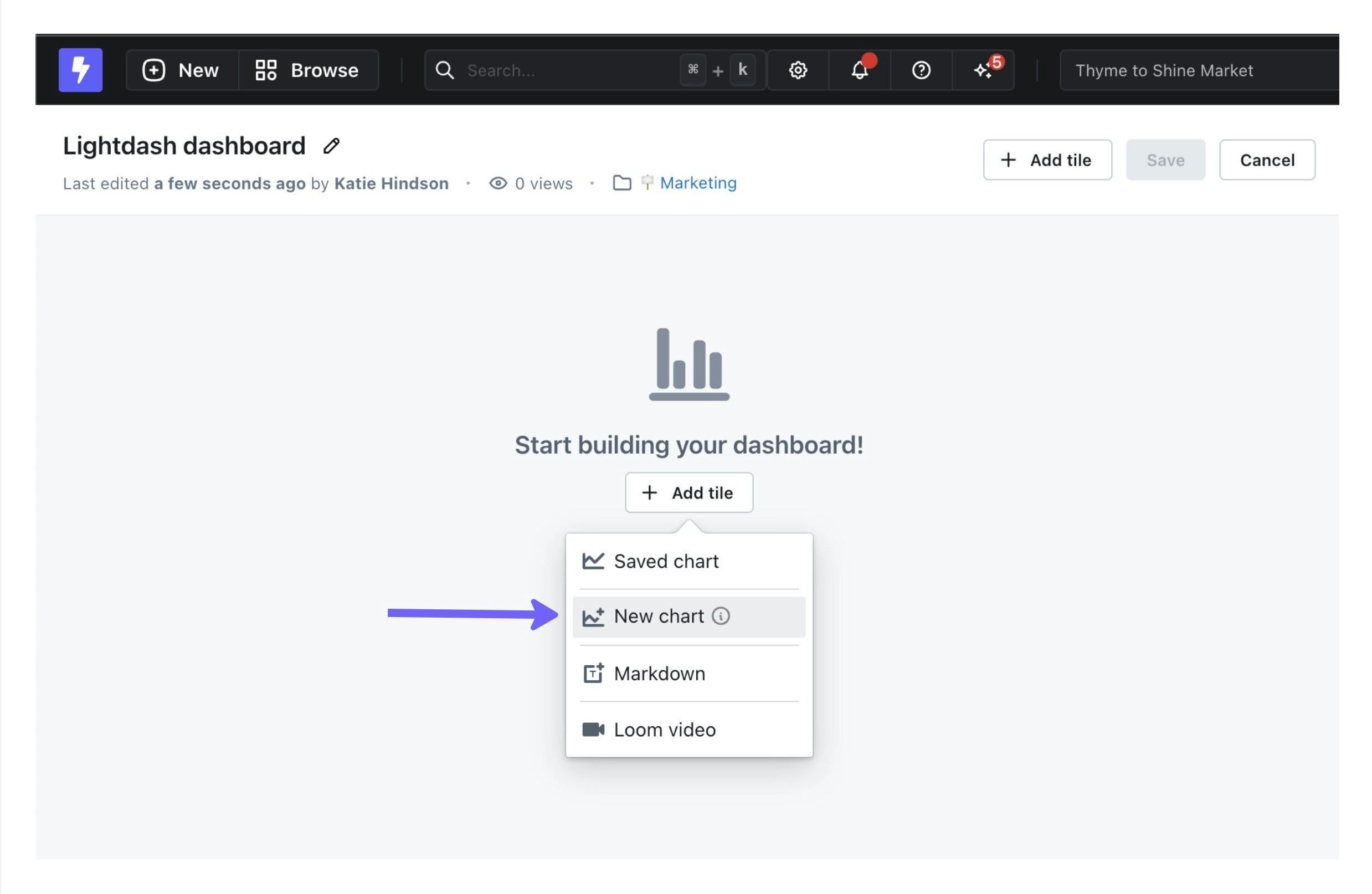 Creating charts from within a dashboard helps to keep your spaces and projects clutter-free from charts that are used only once in a dashboard. Charts that are created from within your dashboard are exclusive to the dashboard. This means that they can’t be reused in other dashboards in your project. Click “Add tile” and then “New chart” to create a chart that is exclusive to the dashboard. You will be taken to the chart builder. Once you save the chart it will appear at the bottom of your dashboard.