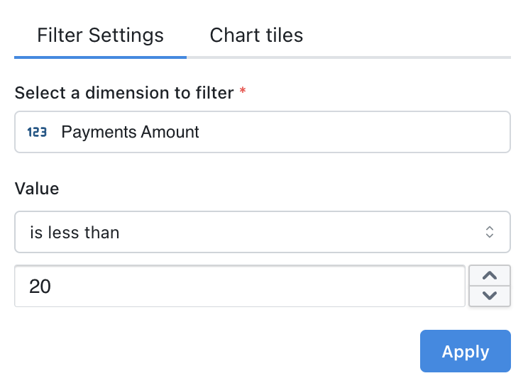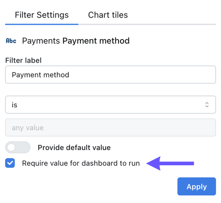 You might want to add an empty-value filter so that your dashboard viewers can choose their own value and explore the data based on their own criteria. Your dashboard viewers might also want to add their own filters to your dashboard.Adding an empty-value filter