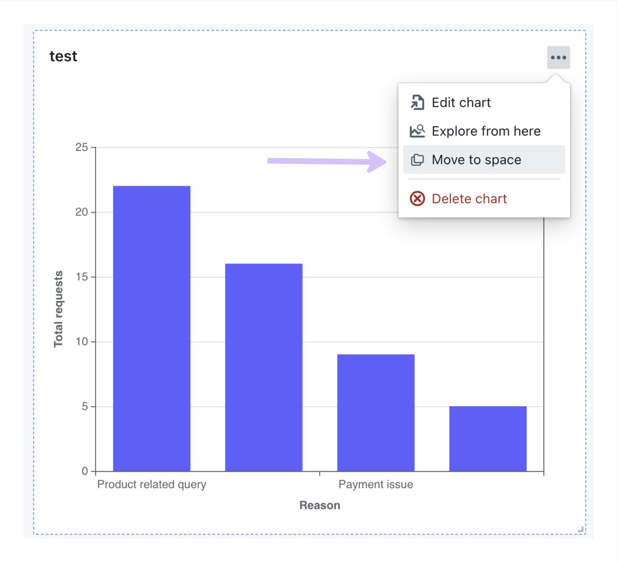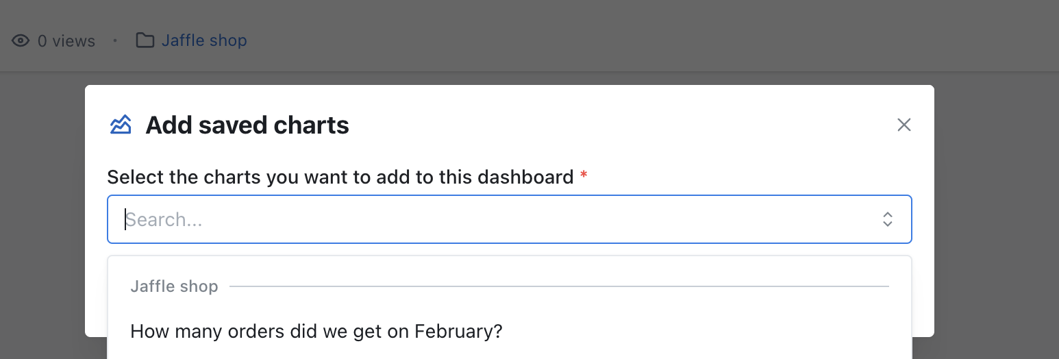 You can add an existing chart to your dashboard by clicking “Add tile” and then “Saved chart”. Clicking any chart will add it at the bottom of your dashboard.