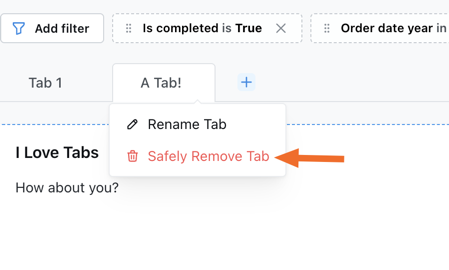 To edit a tab, click on the edit icon to the right of your tab name while in dashboard edit mode. You can either rename or remove the tab from your dashboard.