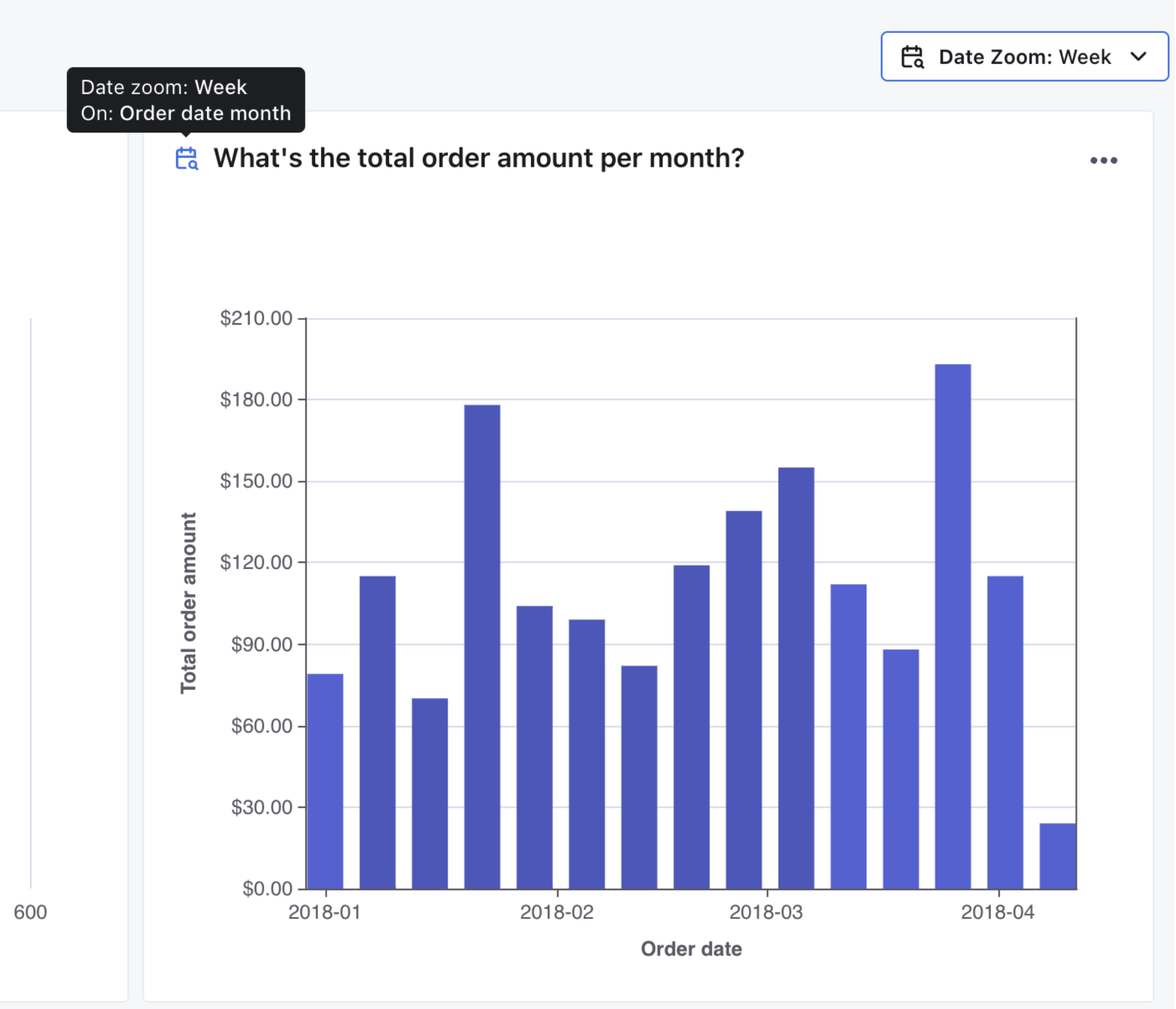 This is helpful if you want to zoom in to look more closely at something, or zoom out to identify a trend. You’re able to quickly view your results at different time granularities without editing the chart. Here’s a quick video showing Date Zoom in action: