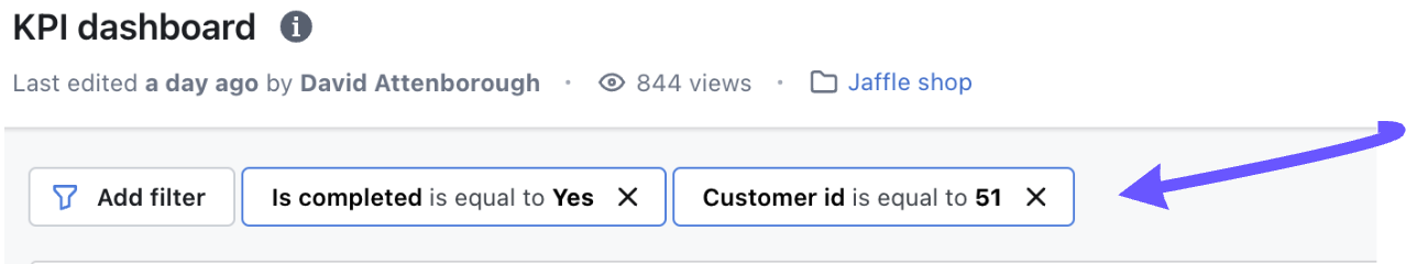 If you add a temporary filter to your dasboard, then only you will see the filters you’ve applied (you won’t be changing the dashboard for everyone who comes to look at it). If you want to save the dashboard filters you’re adding, then check out adding saved filters to your dashboard. There are two ways to add temporary filters to your dashboard.Adding temporary filters using the add filters