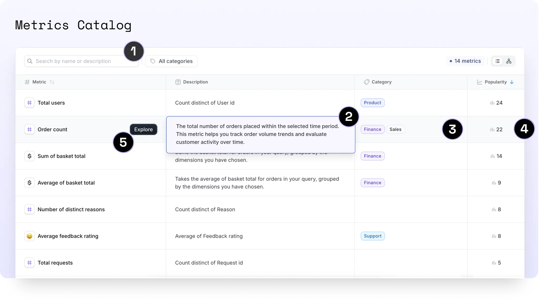 - Search: Easily find metrics by their names or .yml descriptions using the searchbar.