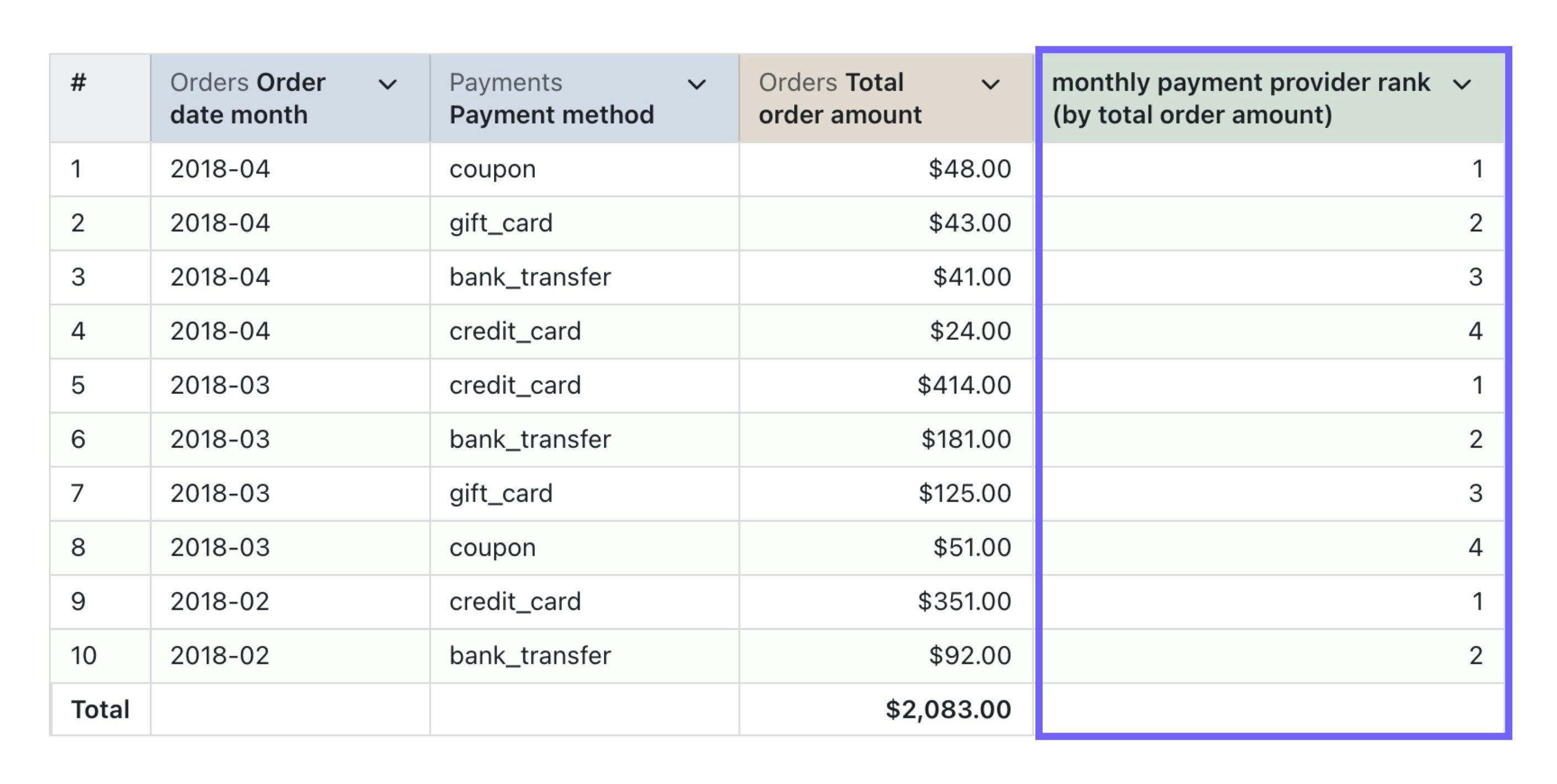 - if you want to have the biggest values with rank = 1, then you need to addDESC