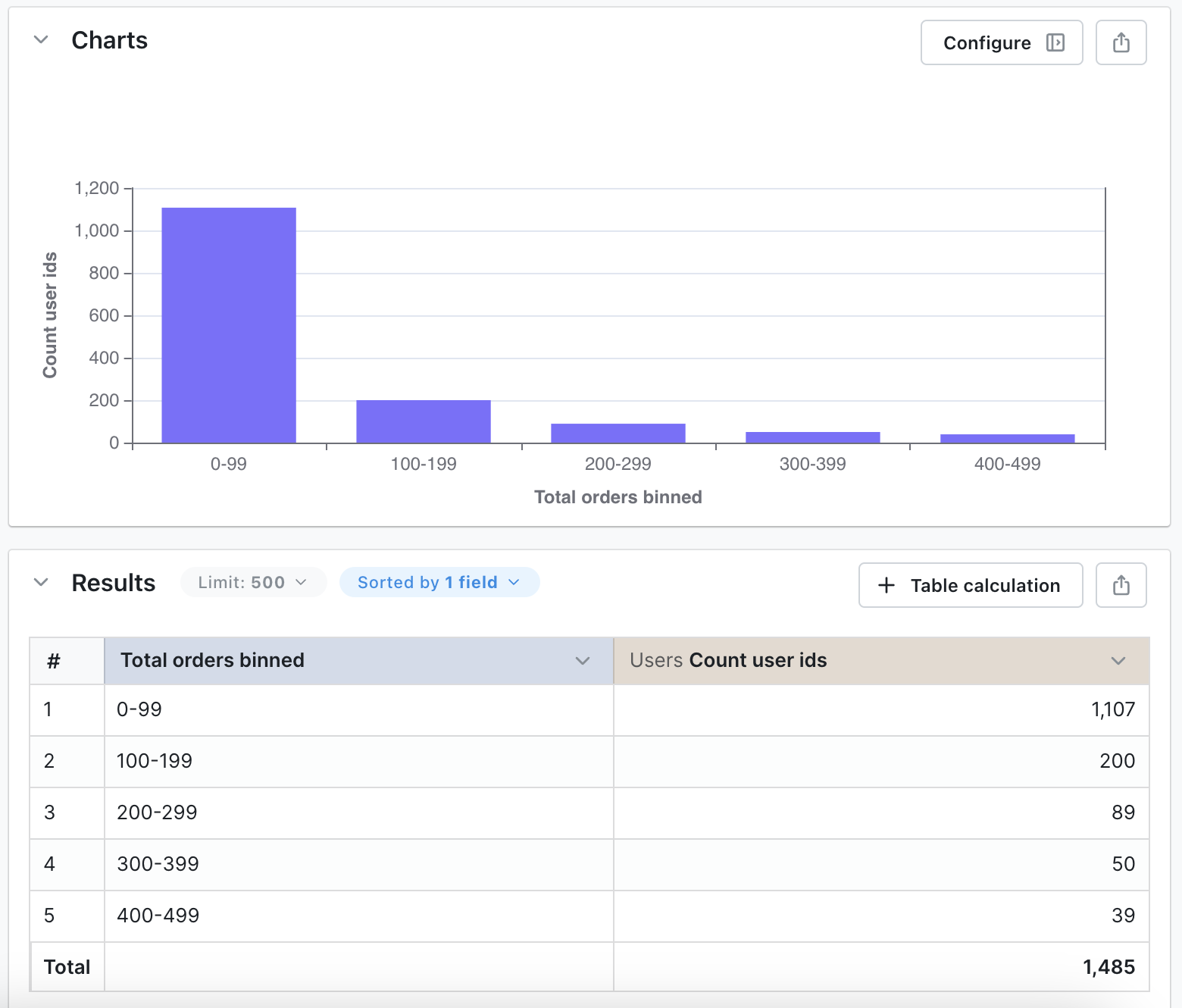 Bins are used to split out values of a numeric dimension into custom sets of ranges. Bins can only be used with dimensions that are numeric. Fixed bins (fixed number and fixed width) will update automatically if the min or max values of your dimension change. To create a bin custom dimension, you just need to:- Click on a dimension’s three-dot
