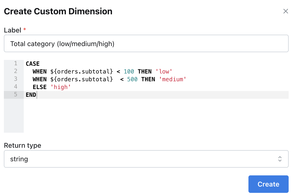 Custom SQL dimensions can query any data from your warehouse, so they should only be created by trusted users (admins and developers). For most cases, it’s safer and more reusable to define dimensions in your dbt files. If you want to make a custom SQL dimension reusable, use the dbt write-back feature to move it into your dbt project.