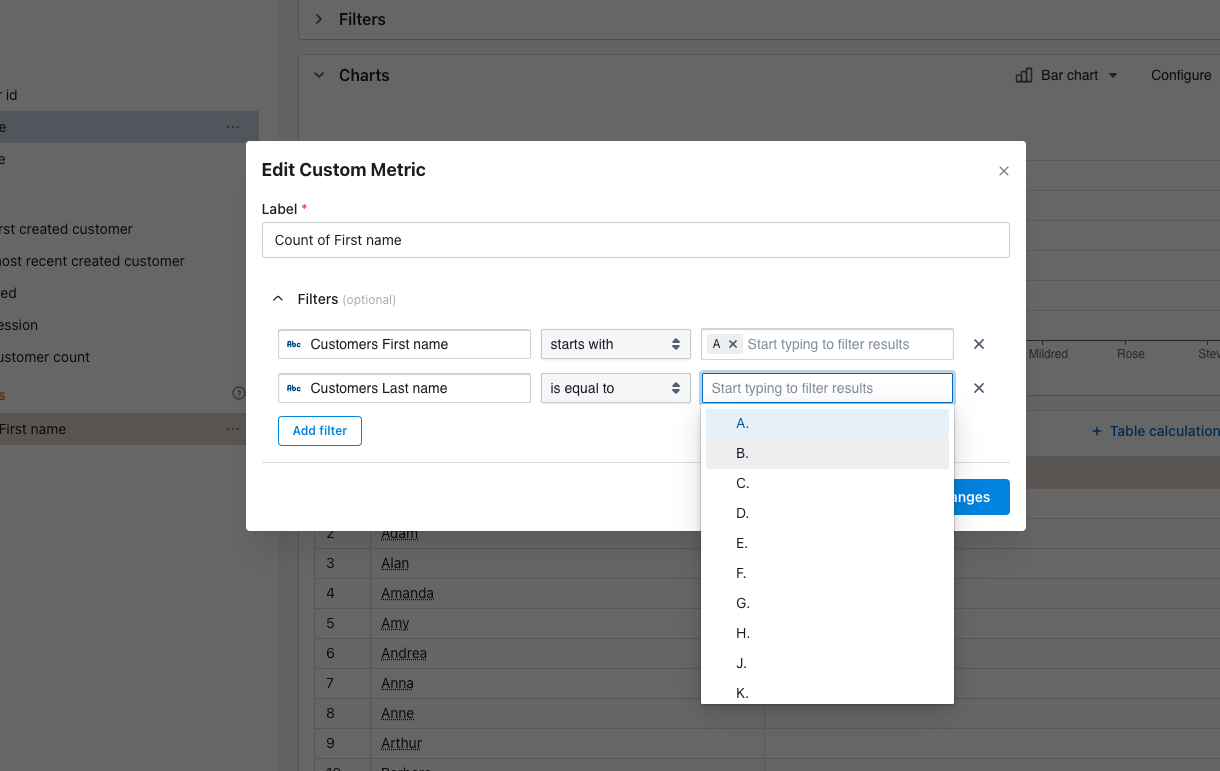 You can add filters to limit the rows included in your metric aggregation. You can add filters when:- You create a custom metric: