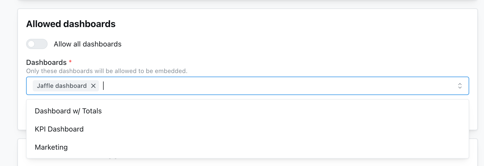 Select the dashboard that you want to embed. Only dashboards included in theallowed dashboards