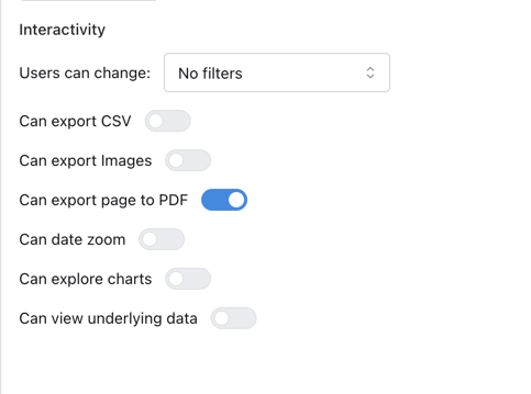 There are options to enable certain dashboard interactivity features on your embedded dashboard in this section. This includes filters as well as granular control over Lightdash features and capabilities. By default, all interactivity is disabled on an embedded dashboard.