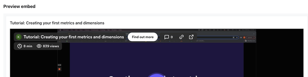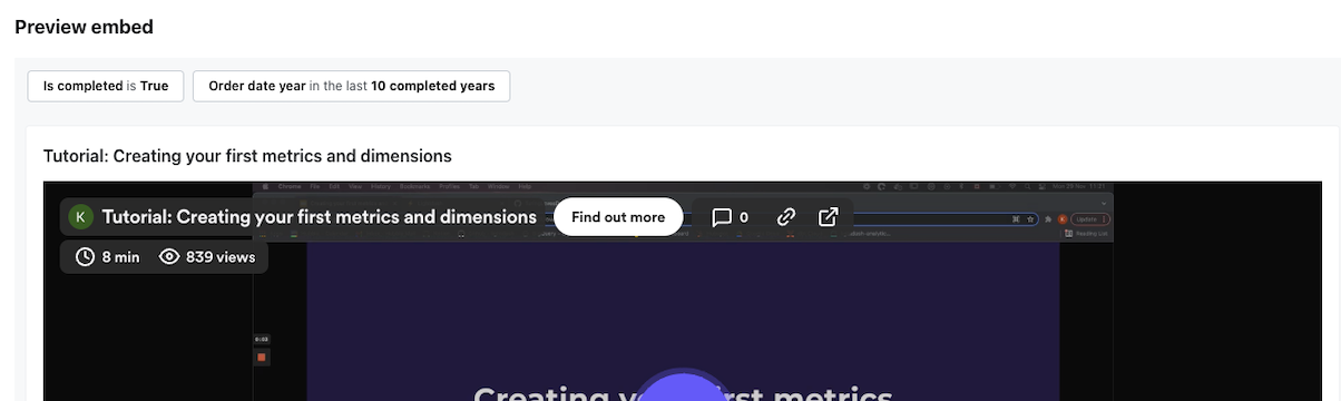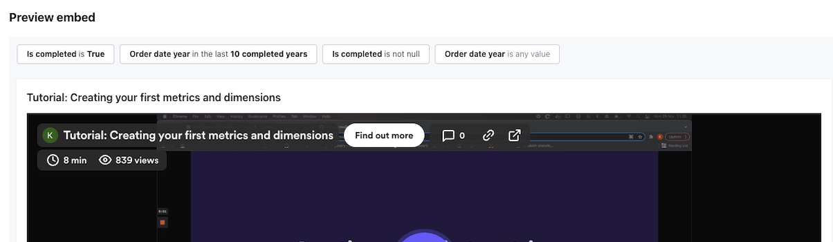 allows you to preview the configuration for your embedded dashboard. This what people viewing your embedded dashboard will see.