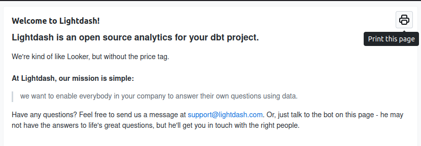 In the embedded dashboard, you have the ability to export the current page as a PDF document. This feature can be accessed by clicking on the Print icon located in the upper right corner of the interface.