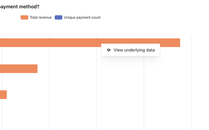 View Underlying Data allows users to open a table for a given dashboard tile, and view a table of the data powering that tile. In the embedded context, users can only view the underlying data—that underlying data cannot be exported or opened in an Explore view. The “View underlying data” option can be opened by clicking on a chart or big number to see the “View Underlying Data” menu option.