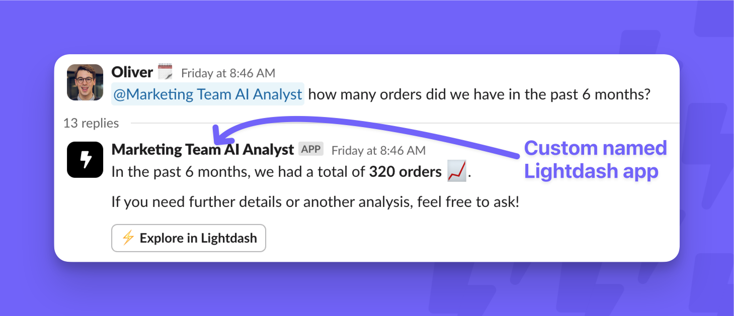 The Slack integration is also used by AI analyst agents to chat with your data and build charts in Slack. Once you have access to AI analysts you can give them access to Slack threads in your integration settings. Remember, to trigger AI responses you need to mention the agent name in every message.