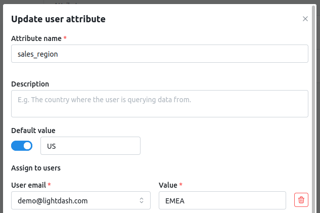 You can use user attributes to filter the rows returned by a query. This is useful if you want to restrict the data based on the user’s attributes. To reference a user attribute in your sql, use the special lightdash reference${lightdash.attributes.<attribute_name> }