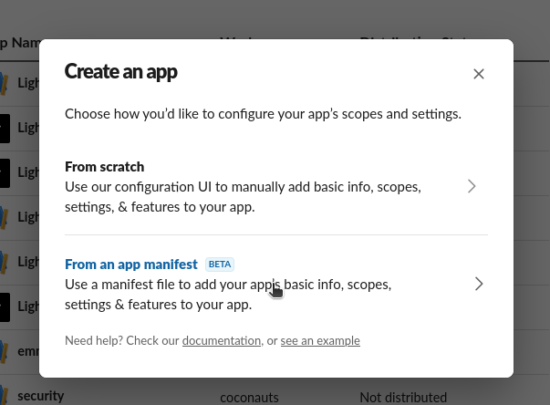 First we will have to create a Slack APP https://api.slack.com/apps?new_app=1 You can selectFrom an app manifest